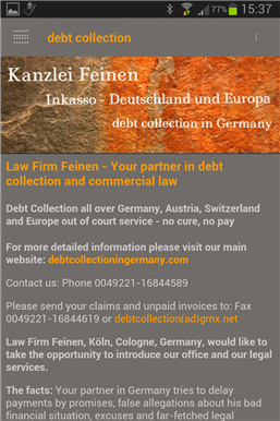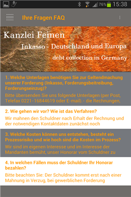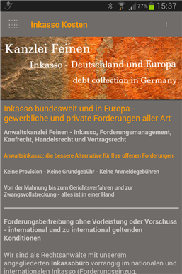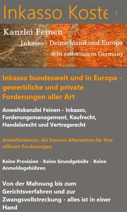 Inkasso bundesweit und in Europa - gewerbliche und private Forderungen aller Art. Anwaltskanzlei Feinen Köln - Inkasso, Forderungsmanagement, Kaufrecht, Handelsrecht und Vertragsrecht. Es ist möglich offene Forderungen direkt einzugeben. Viele Infos um das Thema Inkasso, Tipps, Aktuelles