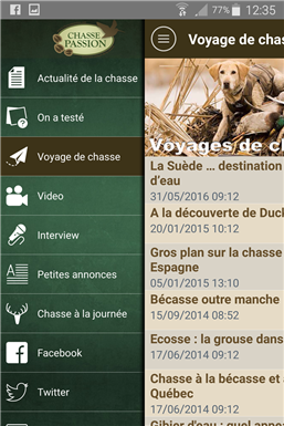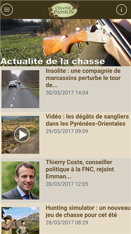 L'application mobile Chasse Passion vous permet d’accéder aux principales rubriques et infos de votre site de chasse préféré en quelques clics. Voici le détail des fonctionnalités : - Actualités de la chasse mise à jour quotidiennement - Nos tests produits (armes, équipements….) - Nos vidéos de chasse - Dossiers voyages de chasse - Interviews - Petites annonces - Facebook - Twitter En résumé l’appli Chasse Passion est à télécharger au plus vite et gratuitement par tous les fans de chasse !