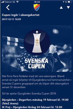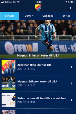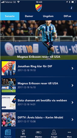 Välkommen till Djurgården Fotbolls app där du kommer hitta nyheter, DIFTV-inslag, tabelläge, matcher, biljetter, spelschema och sociala medier.