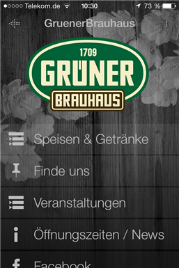 Das "Grüner Brauhaus" in Fürth gibt es jetzt auch als App für das Iphone. In der App erwarten Sie: - Öffnungszeiten - Speisekarten, aktuelle Wochenkarte und Speciales - Anfahrt - Reservierungsmöglichkeiten online und telefonisch - Kontaktformular - Veranstaltungen usw.