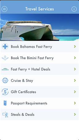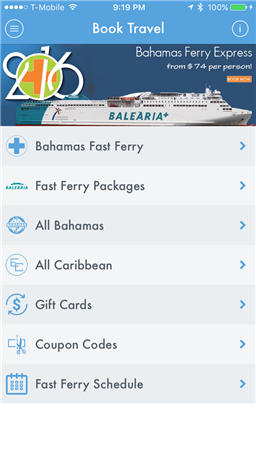 Bahamas Plus is the mobile app from goBahamasPlus, LLC that makes booking, exploring and traveling to the Caribbean easy & fun. Bahamas Plus is your fast, affordable ticket to the Caribbean, featuring the newest transportation options to the Bahamas, including the Bahamas Ferry Express and the Grand Celebration overnight cruise. Two of the biggest reasons that we are your fast, affordable ticket to the Bahamas. With Bahamas Plus you can find out everything you need to know about The Bahamas, plus Mexico, Aruba, Dominican Republic, Costa Rica, Jamaica and many other popular destinations. Search for the best deals, chat with an online travel specialist and see all the cruise & stay options to your favorite destination. Sign-in to your Bahamas Plus online account to access past & present itineraries, make a payment and check your travel points balance. You'll also have access to our 24-hour agent-on-call, local representatives at your destination and much more. The Bahamas Plus mobile app syncs with your online account so that all your information is available to you no matter where you go. Featuring: *Fast Bookings & Product Information *Caribbean Weather *One Touch Call-A-Cab *Download Coupon Codes *Travel Rewards *Book Excursions *E-Travel Documents