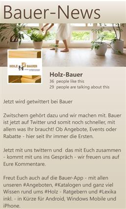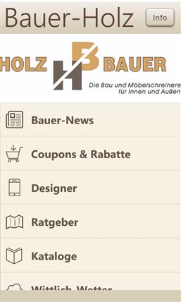 Die Bauer-App ist die App für Alles rund um Holz, Garten, Terrassendielen, Wohnen im Garten und Bauen. Neben den aktuellen Events, finden Sie auch umfangreiche Ratgeber zum Thema Holz und Terrassen. Aktuelle Angebote aus unserem Shop, unsere Kataloge oder Infos zu unserem Unternehmen rund das Angebot ab. Dazu finden Sie alles rund um die Bauer-Card unsere Kundenkarte für Kunden von Bauer.