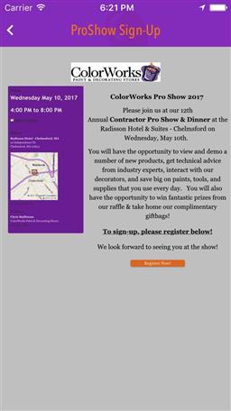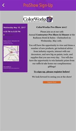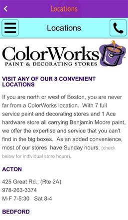 ColorWorks Paint Centers Inc is a premium paint dealership with locations based in the greater Boston area. With our app, customers will be able to view our stores, sign up for our Contractor Show, and view our Pro Show Pricing for 2017.