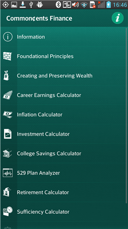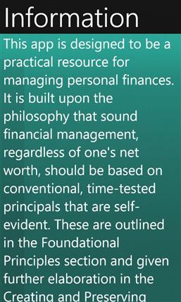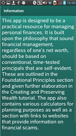 This app is designed to be a practical resource for managing personal finances. It is built upon the philosophy that sound financial management, regardless of one's net worth, should be based on conventional, time-tested principals that are self-evident. These are outlined in the Foundational Principles section and given further elaboration in the Creating and Preserving Wealth tutorial. The app also contains various calculators for planning purposes as well as a section with links to websites that provide information on financial scams.