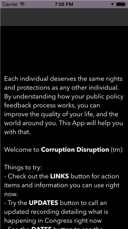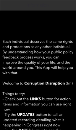 Things to try: - Check out the LINKS button for action items and information you can use right now. - Try the UPDATES button to call an updated recording detailing what is happening in Congress right now - See the DATES button to see the current schedule for Congress and see what bills you might need to add input on - At the FAQ button, you will find the latest, and most often asked, current user questions with their answers - Try the VIDEO button to see videos on hot public policy topics - Visit the TWEETS button(s) to see some of the most popular updates - For an often strange and amusing look at the latest public policy memes in online news and blogs check out the MEMES button - Never get all of your news from just one source. Try NEWS1, NEWS2, NEWS3... etc.. for breaking policy news - To get even more hands-on, go to anti-corruption school, on-line, via the SCHOOL button Much More...