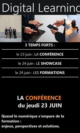 LA CONFERENCE : le jeudi 23 juin 2016 16 intervenants, consultants ou praticiens de grandes entreprises partageront leurs expertises afin de permettre aux participants • d’identifier les bouleversements induits par le numérique de la vie quotidienne au travail et dans les organisations, • d’en déduire les impacts majeurs sur le domaine de la formation et de l’apprentissage professionnel, • d’évaluer les enjeux primordiaux pour la fonction formation de développer une offre digitalisée, • de déterminer les points forts des grands dispositifs pédagogiques digitaux • et d’obtenir des clés tangibles pour la mise-oeuvre d’une stratégie Digital Learning pertinente. Une journée intense d’échanges et de convivialité pour inventer ensemble la formation de demain.