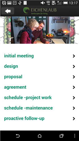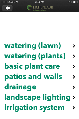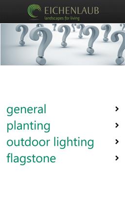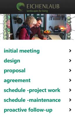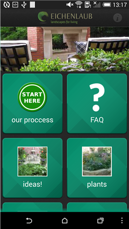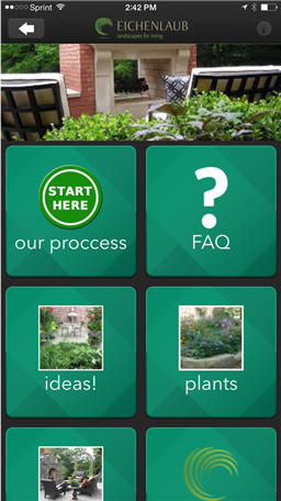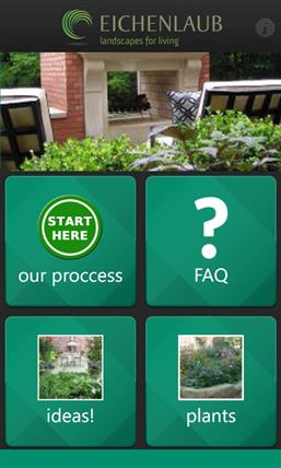 We created the Eichenlaub Landscaping App to make your life easier! If you are considering working with us you can touch the our proccess button to learn about our process from start to finish. Go to the FAQ button for answers to commonly asked questions. Many of these are good questions to ask when you are thinking of working with any contractor. Clear answers to these questions will help to set the right expectations going forward. Surprises are great on birthdays and Anniversaries but can be stressful and frustrating when working with service companies. The products button will provide you with information on different types of landscaping products and services. Need more inspiration? Touch the current, more ideas!, and Projects buttons for more photos and ideas.