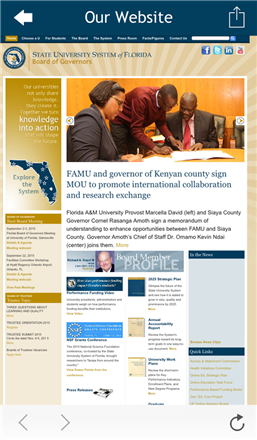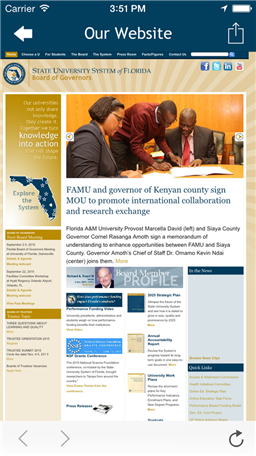 • VIEW senior staff and board member bios; • LOOKUP system universities with an interactive map, description, and contact information; • ACCESS the our calendar, including meeting and events; • VIEW press releases; • READ daily news clips and weekly ‘Did U Know?’; • ACCESS meeting archives and downloadable university brochures and pamphlets; • LEARN about our performance based funding model and allocation summaries; • ACCESS our Facebook and Twitter profiles; • CONTACT the State University System of Florida