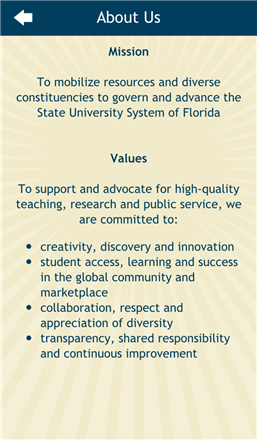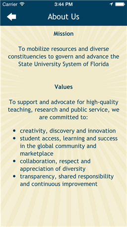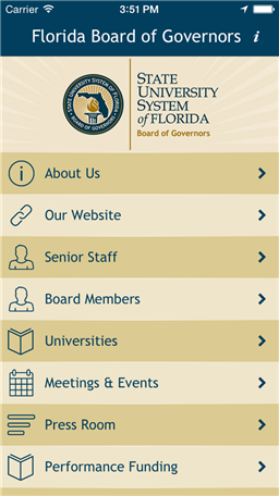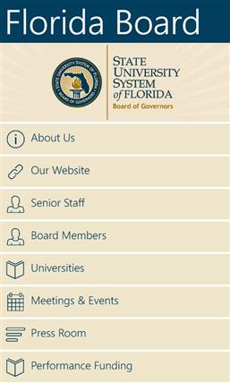 The Florida Board of Governors mobile app allows you to receive the latest information from the State University System of Florida right from your mobile device. Users have access to a variety of features including daily news clips, meeting and event archives and updates on new system initiatives. The State University System of Florida and the Board of Governors support and advocate for high-quality teaching, research and public service, and our mobile app illustrates this mission through the following tools: