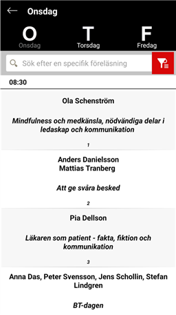 Föreläsningar: Här hittar du huvudfunktionen för vår app. Här kan du ta del av kongressens olika föreläsningsmoment. Dessa är sorterade efter dag och tid. Klickar du in på en av föreläsningarna kan du ta del av abstraktet för föreläsningen. Du kan genom filterfunktionen i högra övre hörnet sortera föreläsningarna efter det som är relevant för dig, t.ex. efter kursen du ska gå, eller föreläsningssalen du är nära.