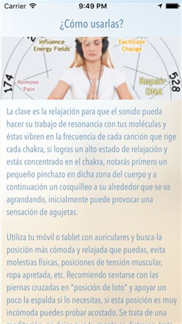 Incluye: - 9 canciones gratuitas creadas para meditar, con una duración de 3'33" cada una. - 9 sonidos puros gratuitos creados para meditar, con una duración de 3'33" cada una. - Discografía con canciones profesionales creadas para meditar. - Explicaciones sobre las Frecuencias Solfeggio, ¿Qué son?, ¿Qué hacen? y ¿Cómo se usan?.