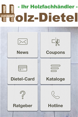 Dietel-App - App für Alles rund um Holz, Garten, Terrassendielen, Wohnen im Garten und Bauen. Neben den aktuellen Events, finden Sie auch umfangreiche Ratgeber zum Thema Holz und Terrassen. Aktuelle Angebote aus unserem Shop, unsere Kataloge oder Infos zu unserem Unternehmen runden das Angebot ab. Dazu finden Sie alles rund um die Dietel Card unsere Kundenkarte für Kunden von Holz Dietel.