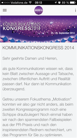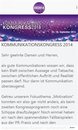 Der Kommunikationskongress 2014 für die Hosentasche und die Handtasche. KK2014 ist die App zum Kommunikationskongress 2014. Die App wird gemeinsam vom Bundesverband deutscher Pressesprecher (BdP), der Helios Media GmbH und der news aktuell GmbH bereitgestellt. Die App KK2014 macht alle Informationen rund um den Kommunikationskongress 2014 mobil verfügbar. Sämtliche Inhalte können mit einem Klick auf Twitter und Facebook geteilt und per E-Mail weitergeleitet werden.