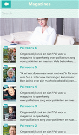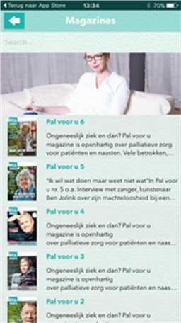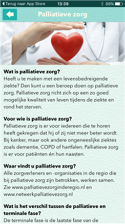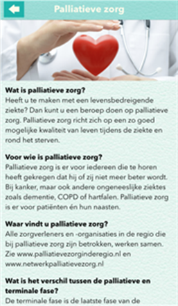 Ongeneeslijk ziek, hoe ga je daarmee om? Wat is palliatieve zorg en waar wordt palliatieve zorg gegeven? Wat kost dat? De Pal voor u-app bevat uitgebreide informatie over de mogelijkheden omtrent palliatieve zorg. Ook is er aandacht voor allerlei aspecten rondom het levenseinde.