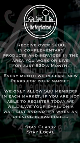The Neighborhood Membership Company brings you together with the businesses in your local area. As a member you will receive eight perks every month that get you complimentary experiences in the areas of Food, Fitness, and Fun. As a member you pay $20 each month and you receive over $200 in complementary items. The perks are good for 60 days and you are not required to make any additional purchases at any of the businesses you go to in order to redeem your perk. If you feel like you would like to cancel your membership for any reason, you can let us know and we will send you a full refund for the last month you paid to be with us. We only allow 500 members in each market and once you are a member you may refer up to two people. For each referral you send us that becomes a member you will receive a free month of your membership for the following month. We are committed to giving you a new way of experiencing the local area around you and we hope you love this service as much as we do.