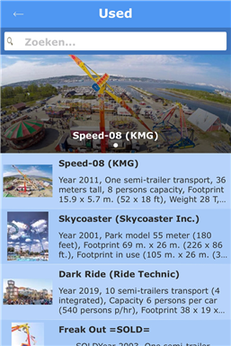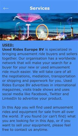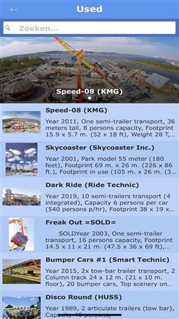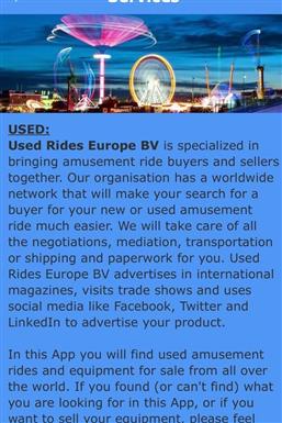 The Used Rides Europe app gives you access to an accurate database with used amusement rides that are currently for sale through the Used Rides Europe BV company. The app shows images, technical details, pricing and location of the equipment. There are links to Facebook, Twitter and the official website to obtain additional information or to contact Used Rides Europe BV. The app also gives you access to the KMG, Concept 1900 and CMC websites and financing and leasing companies. This app gives you quick access to the latest rides for sale additions.